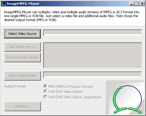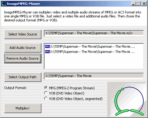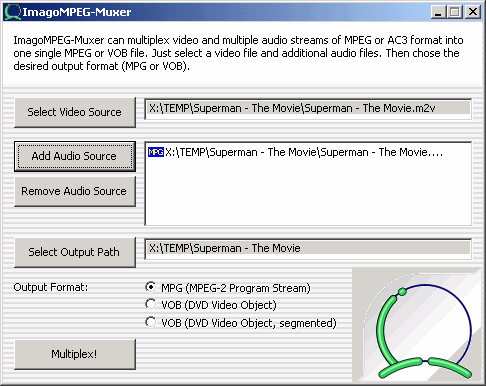 click on "Remove Audio Source" and finaly, click on the "Select Output Path" to where you want the new file to be created, then select the "Output Format" which can be an MPEG2 file or even a VOB file format and click on "Multiplex" to begin processing.