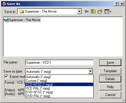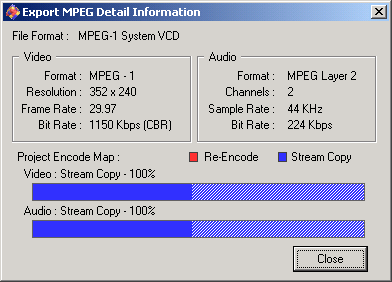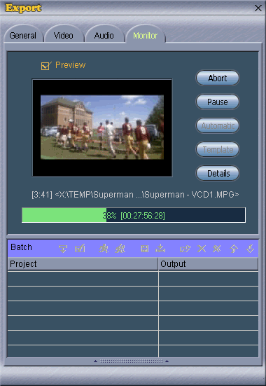 | Step 4(a/b) - In the "Export" window which will appear, you will be able to use "Monitor" to view the progress and if you click on the "Details" button you can all he "Export MPEG Detail Information" regarding your exported clip. a) b) ![]() |