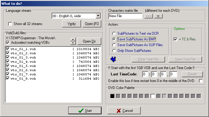 Step 1(a/b/c/d/e) - Click on "File" and select "Open VOB(s)", then click on "Open IFO" and open your movie's IFO file. Now select the language you wish to create Subtitles for. Under "Action" select "Save SubPictures as BMP" and make sure "TC & Res" in the "Options" are selected. Now click on "Start" and write a filename. (* Example: ENG for English, incase you want to create several languages! *)![]() ![]() ![]() ![]() ![]() |