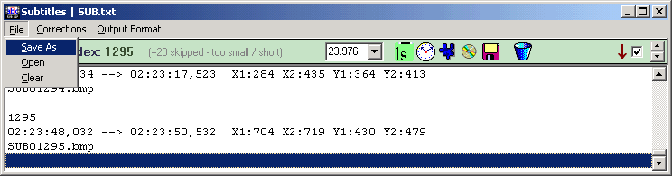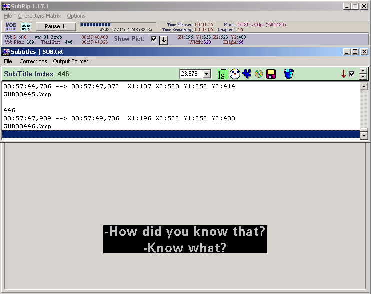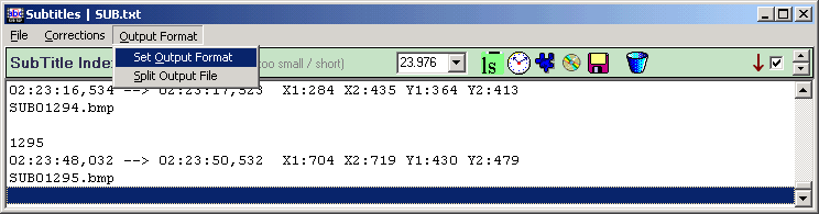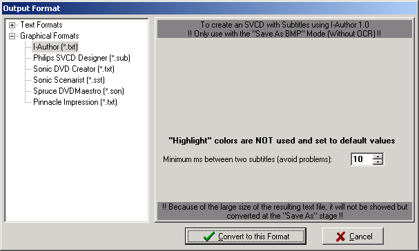 Step 3(a/b/c/d) - Once the program has finished creating the BMP's, click on "Output Format" and select "Set Output Format" and make sure to setit to the correct format under the "Graphical Formats", here i've selected "I-Author (*.txt)". Now click "Convert to this Format" then click on "File" and select "Save As" and type a filename and click on "Save" to create your subtitles definition txt file.![]() ![]() ![]() ![]() |