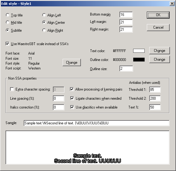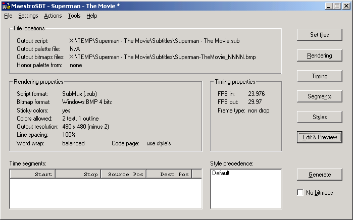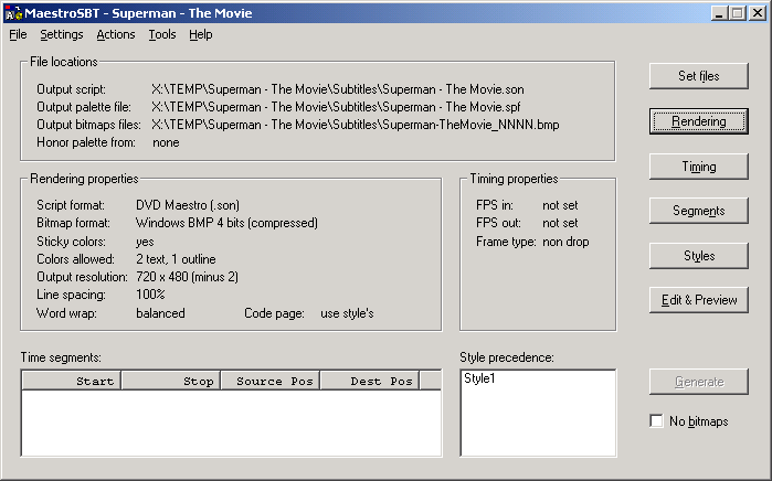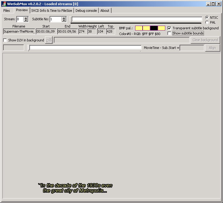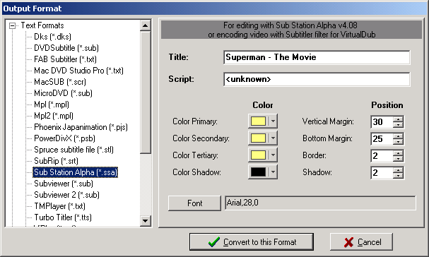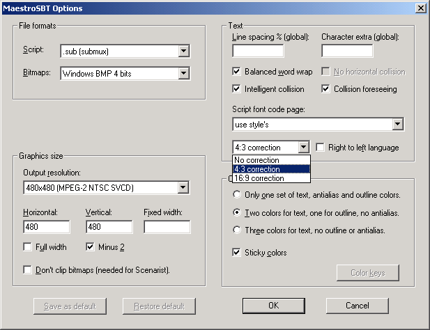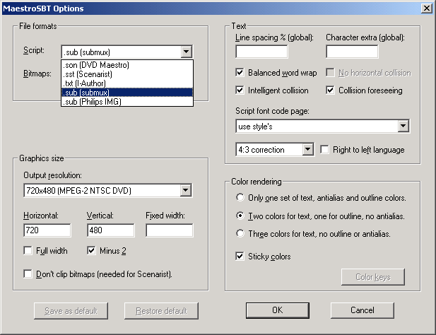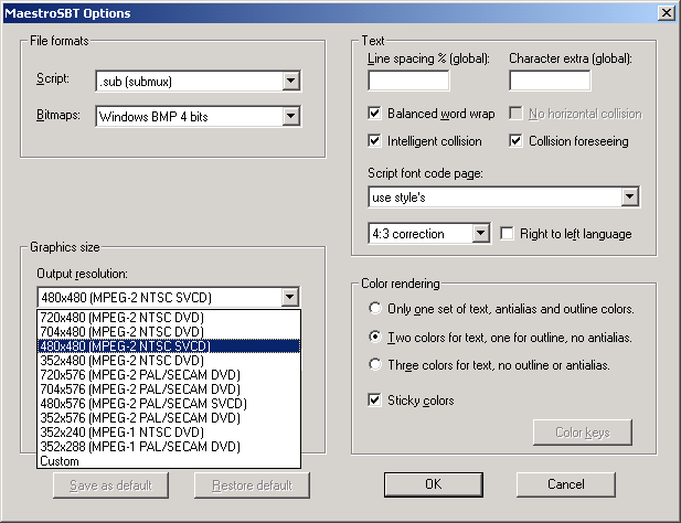 Step 2(a/b/c) - Under the "File formats" pulldown, select the ".sub (submux)" option. Now in the "Graphics size" you need to select the type of movie the Subtitles will be muxed into, use the "Output resolution" pulldown to select your movie type and resolution. In the "Text" category you can select the "Script font code page" and select if your movie is "4:3" or "16:9" and also the language start point. Click on "OK" to get back to the main program.![]() ![]() ![]() |