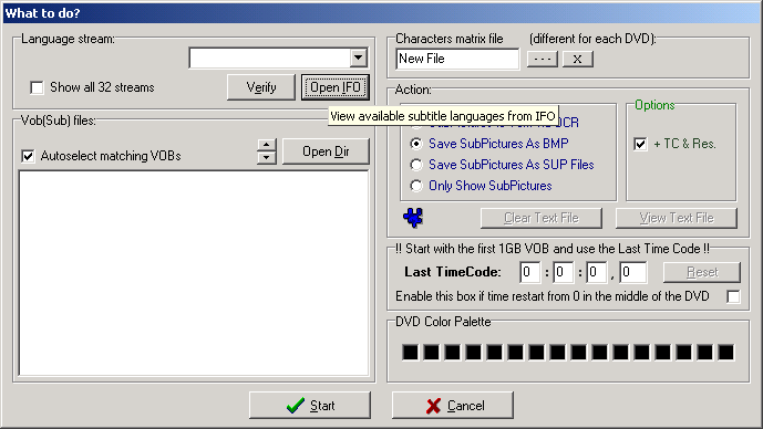 Step 1(a/b/c/d/e) - Click on "File" and select "Open VOB(s)", then click on "Open IFO" and open your movie's IFO file. Now select the language you wish to create Subtitles for. Under "Action" select "Save SubPictures as BMP" and make sure "TC & Res" in the "Options" are selected. Now click on "Start" and write a filename. (* Example: ENG for English, incase you want to create several languages! *)![]() ![]() ![]() ![]() |