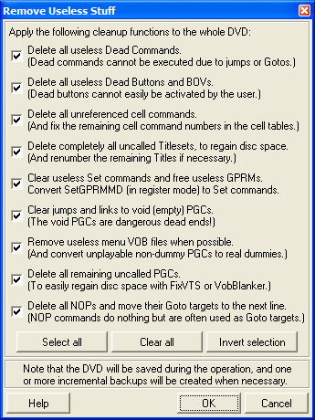 Remove Useless Stuff goes through these functions automatically in the order on the Remove Useless Stuff dialogue. You can select all or only some of the options. It is a very powerful one-click way of cleaning up your DVD structure. Where there is a potential for risk, PgcEdit will warn you. Read the warnings carefully and act on them accordingly.