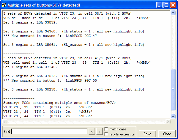 Multiple sets of buttons/BOVs: PgcEdit will notify you on loading a DVD if it finds multiple sets of buttons or BOVs and in which VTS the multiple button sets are located. As well, it will automatically mark the relevant PGCs with the comment ‘<MBS>’ if the option to allow automatic comments in the labels is turned on in the Options → Command Editor menu.