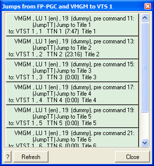 Jumps from VMG to current VTS (Ctrl + q): Shows all jumps from the video manager (VMGM PGCs) to the current VTS (menu and titles domains). You may click on a command in the list box to jump to it.