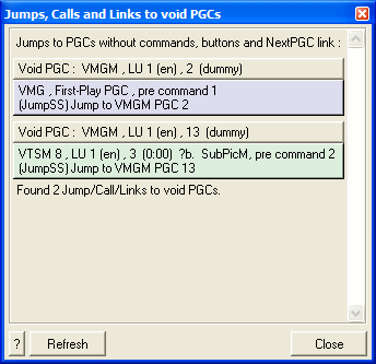 Find jumps to void PGCs: Finds all jumps to PGCs which do not contain video content or commands, identifying the void PGCs and the commands that jump to them. You may click on these to jump to the various commands/PGCs. Note – a PGC with only a NOP in it is considered void.