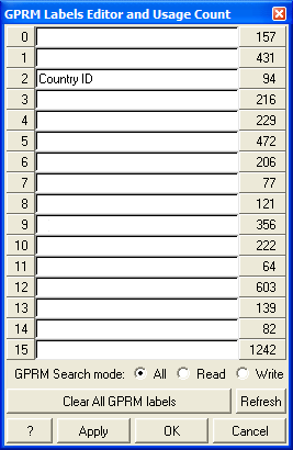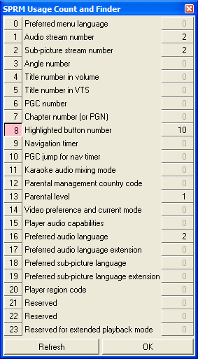 GPRMs (Ctrl + Shift + i): Displays a list of the 16 GPRMs and their usage in the DVD. This includes commands in the menu buttons and buttons over video. You may enter a label for the GPRM in this dialogue, or click on the number of times the GPRM is referenced to see all the references to it in the DVD. Clicking on the GPRM itself will set it as a breakpoint in the Trace Watch List (trace will stop whenever that GPRM is encountered – see here).