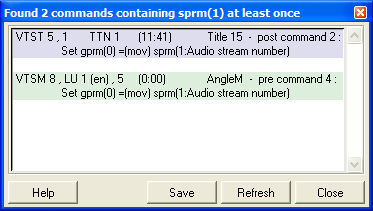 DVD commands: Display the commands of all the PGCs of the DVD. The commands are displayed in a window and can be saved to disc and searched. This function also lists the menu button commands, if applicable. For complex DVDs, this function may take some time to perform.