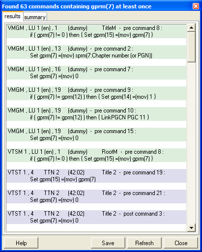 Find Useless Set GPRM commands: Finds, and displays, GPRMs which are set needlessly and unused elsewhere. They are automatically marked with the GPRM comment as “useless”. You can click on the commands in the display to go to each command. To remove them automatically, either run Remove Useless Stuff or Clear Useless Set GPRM commands from the DVD Menu.