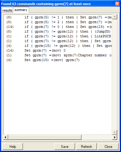 Click the appropriate radio button and then the number of occurrences for the particular GPRM you are interested in to bring up the relevant list of commands. As for the search box, there is a summary tab, where commands which contain the selected GPRM are sorted and summarised.