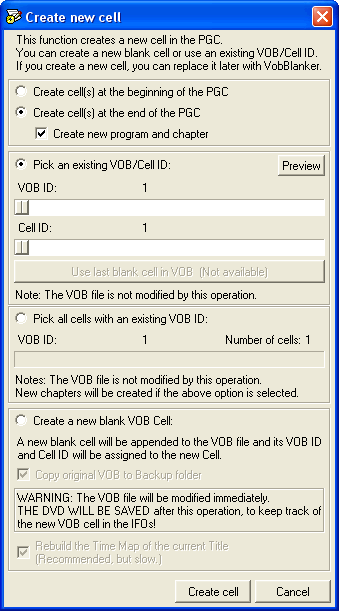Click in Create a new blank VOB cell if you want to add a new blank cell (for example, a tiny cell at the end of the PGC). In this case, the VOB will be updated. It’s a good idea to back it up in case you wish to restore your backup, but this can take a bit of time on large VOBs and is not strictly necessary.