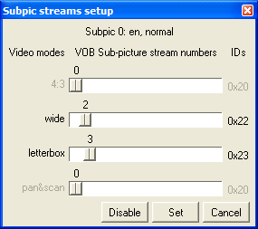 The hex values of the stream numbers are identified. For sub-picture streams, you may assign stream numbers for the 4 viewing modes (4:3, widescreen, letterbox and pan & scan). The modes that are not active for the current domain are greyed out.