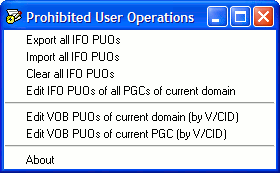 Export/Import all IFO PUOs: Exports/imports the current PUOs of the DVD (including the PUOs in all PGCs and the PUOs in the Table of Titles, VMG_TT_SRPT) to/from a file. The .puo file is editable in a text editor such as Notepad.