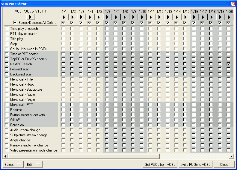 Edit IFO PUOs of all PGCs of curent domain: This function sets or clears selected PUOs for the whole domain of the current VTS. For example, it is often useful to prevent exiting a menu except on the press of a button. In this case, you would want to set all PUOs to 192 for the menu domain of the VTS (prohibits previous or next program search).