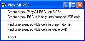 This plugin can find unreferenced cells in the domain or the entire DVD by scanning the VOB files. It can also create a Play All PGC (i.e. one that contains all the VOB/Cell IDs in the domain) from those VOBs. Alternatively, it can create a new PGC in the domain with just unreferenced material from that domain – this is useful if you have inadvertently deleted a cell and need to re-use it.