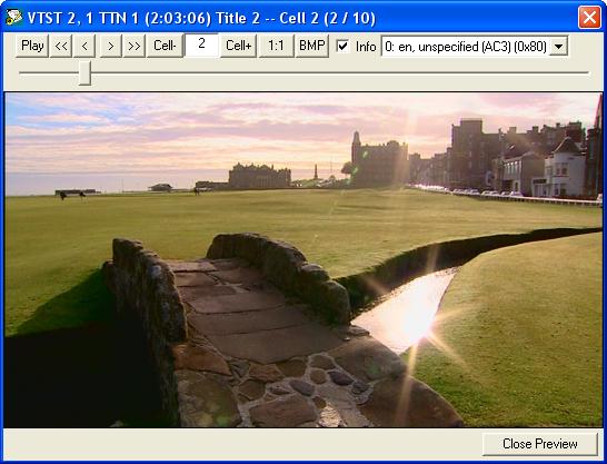 The preview window is a little DVD player, where you can Play the PGC, go forward or back by an I-frame at a time (> or <) or by 5 I-frames at a time (>> or <<). You may advance forward to the next cell (Cell+) or back to the previous one (Cell-).