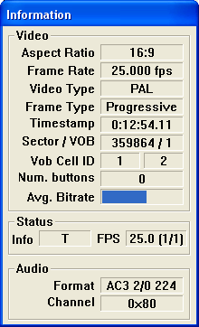 You may also make a bitmap of the current frame by pressing the BMP button. Pressing Shift-BMP will make a graphic in the PPM format. Checking the info box will give information about the cell being played, including its VOB/Cell ID, aspect ratio, frame rate, time, the sector being displayed, number of buttons (if a menu) etc. Information about the Title, PGC and Cell is displayed in the Preview’s titlebar (as well as the PGC Comment, if there is one).