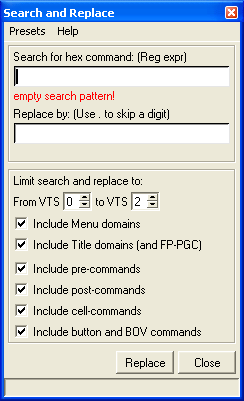 Use this function to search for either a hex command (in full) or a regular expression matching some hex command (with spaces between the bytes) and replace it globally (or within selected domains) with another command.