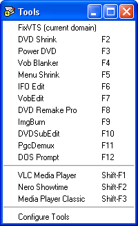 The Tools menu is a configurable menu in which you can define external programs, which can be run from inside PgcEdit. One tool is already pre-configured – FixVTS (within the current domain). When called for the first time, PgcEdit will ask you to select the FixVTS.exe file on your hard drive.