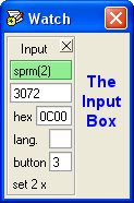 “Input” shows the effect of a command and how many times the register has been set. At a break in the playback, or if you are tracing in “step mode”, you may also input your own value in the input box to see the effect of a change in a command before you actually change it (note that you must press ENTER to accept the change). You may input in decimal, hex, ASCII (for language codes) or button numbers. Illegal/invalid inputs are rejected by PgcEdit.
