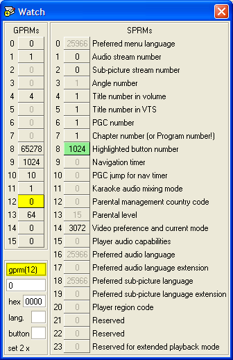 This watch is more comprehensive, adding the registers and SPRM labels. At the start of your session, the SPRM registers will reflect your virtual player setup. During the trace, the registers are updated as each command is executed. Registers not yet used are greyed out. You can see that GPRM(12) was the last set (it is in yellow) and was set to 0, while GPRMs 2, 3, 5, 6 and 7 haven’t been touched yet.